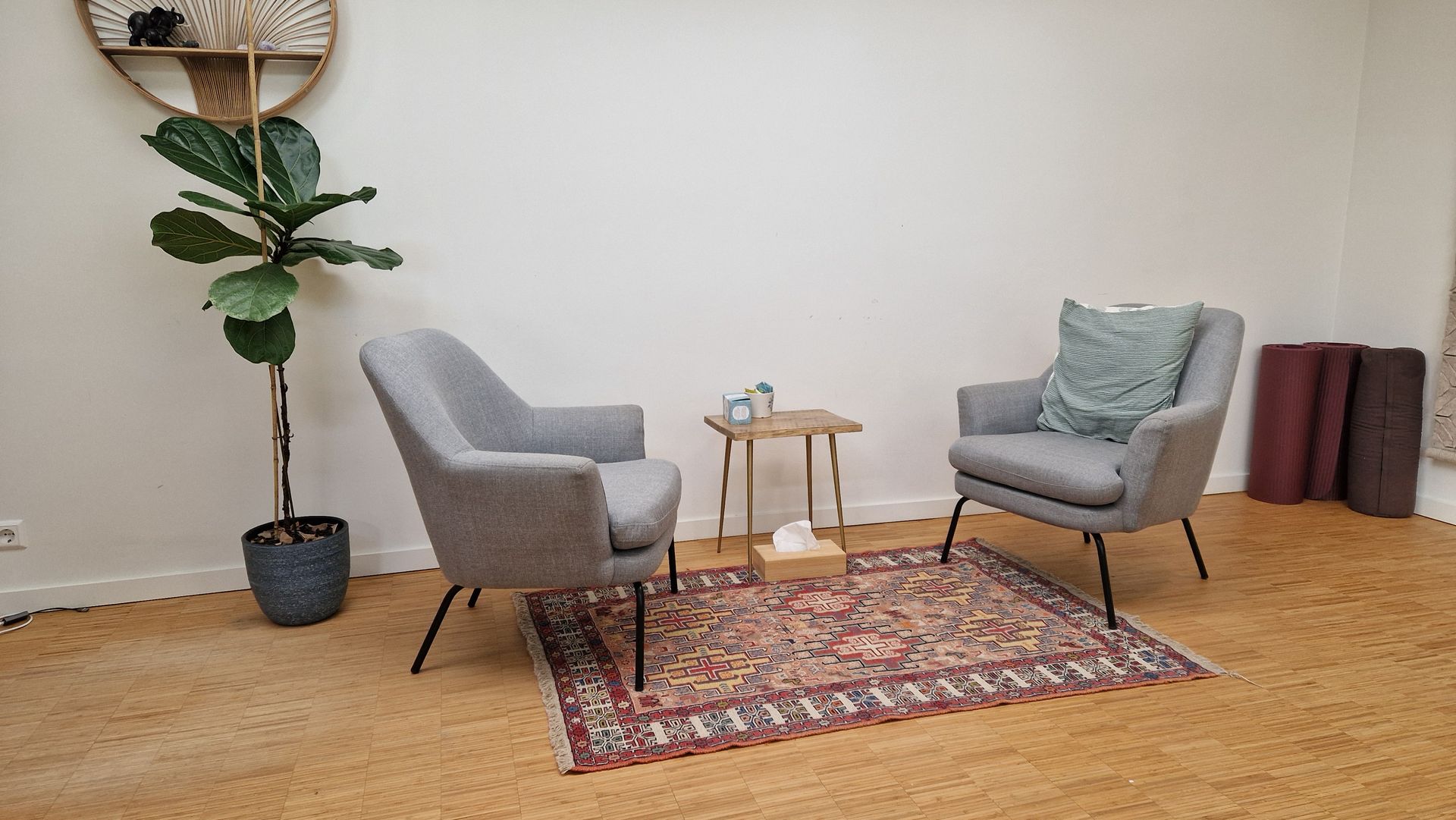 De praktijkruimte is ongeveer 20 m2 en geschikt voor individuele coachsessies of groepen van maximaal 6 personen